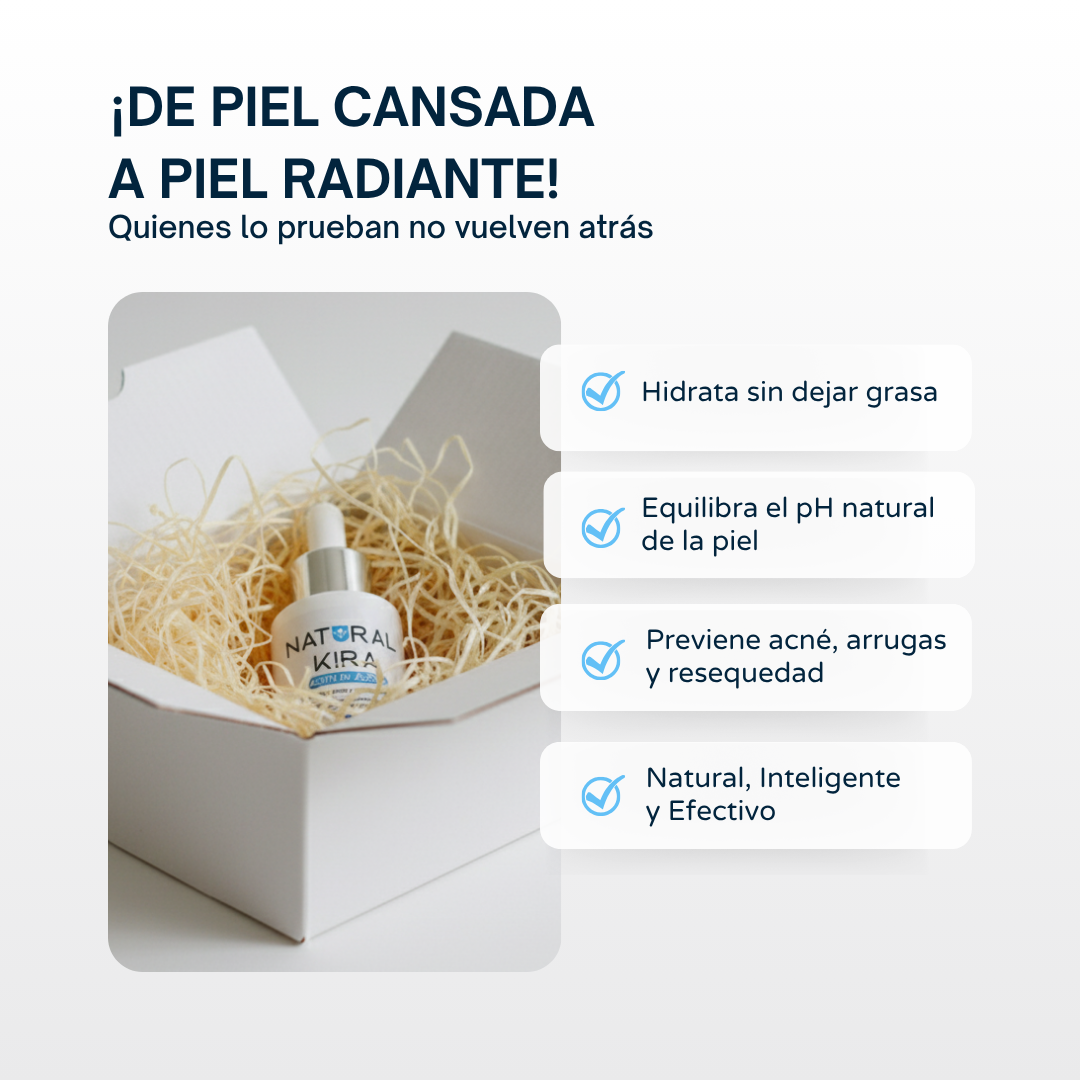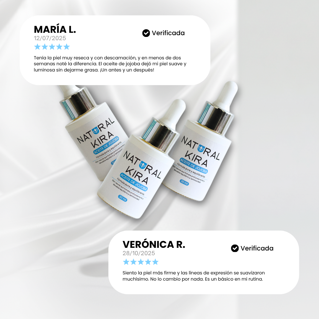 En Natural Kira, creemos que la naturaleza tiene la respuesta a lo que tu piel realmente necesita. Nuestro Aceite de Jojoba 100% Puro está diseñado para ofrecerte una experiencia de cuidado premium sin químicos, con ingredientes naturales que trabajan en armonía con tu piel. A diferencia de otros productos, nuestra fórmula limpia y efectiva se adapta a tu cuerpo, ofreciendo resultados reales y duraderos.